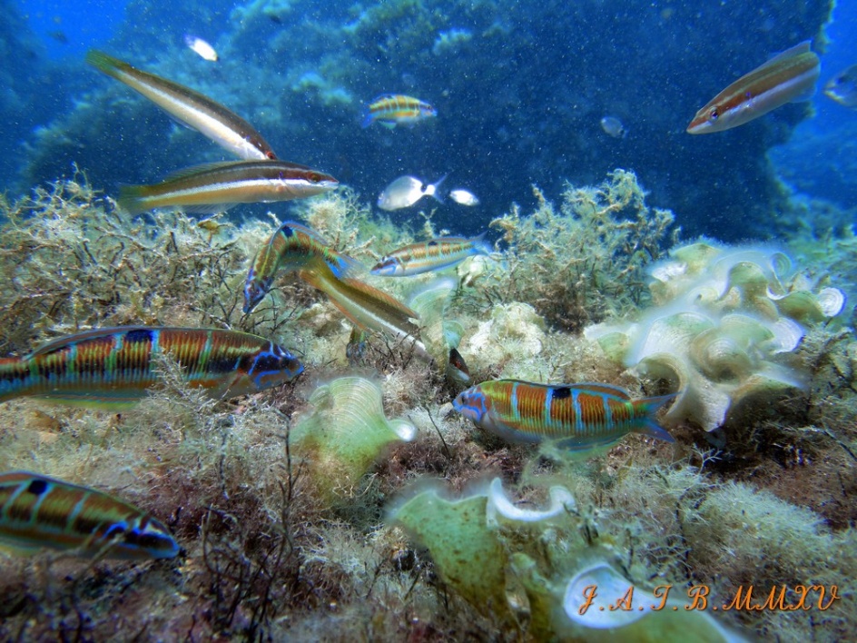 En esta foto se pueden observar dos especies de labridos, por una parte un grupo de doncellas ( julias ) hembras y los fredis ( pez verde ) también hembras buscando comida entre las algas.