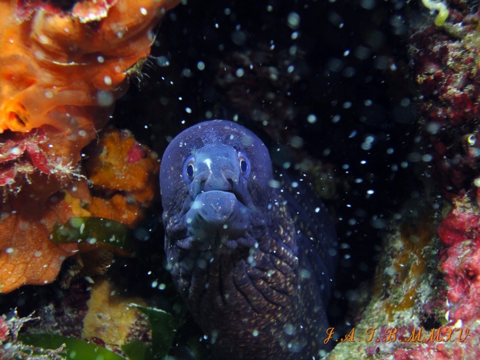 Bienvenido / Fotografias Submarinas / Fotografías Submarinas de Juan A. Torres / MORENA ASOMADA EN UNA GRIETA