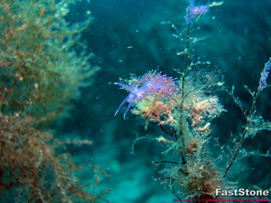 Se trata de una Flabellina affinis, un de los mas bonitos de la familia nudibranquia, vive y se alimenta de colonias de hidrozoos que a su vez les convierten en seres muy tóxicos para el resto de los animales marinos.