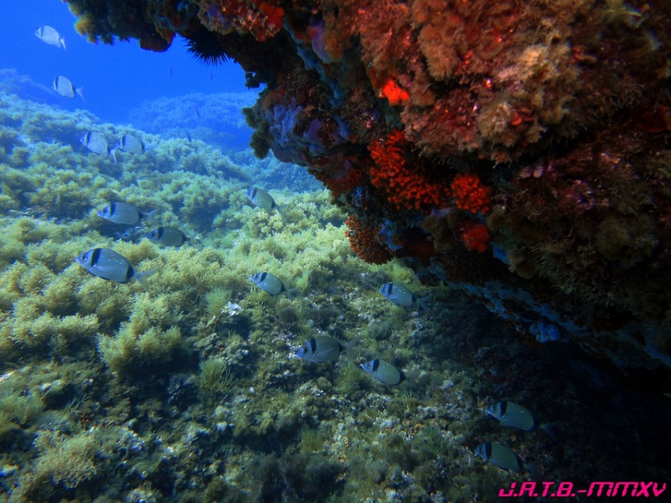 Bienvenido / Fotografias Submarinas / Fotografías Submarinas de Juan A. Torres / GRUPO DE VARIADAS ( MOJARRAS ) BAJO UNA GRAN ROCA